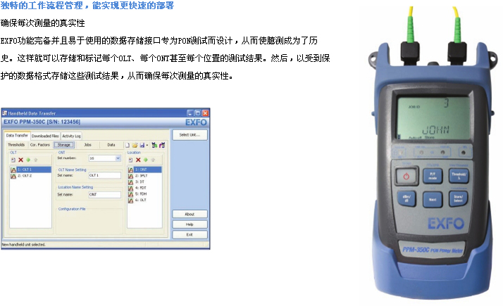 领跑者的步伐现在更快 当FTTH首度部署时,EXFO便已应对自如 - 即通过领先的同步上行/下行测量技术进行测试(通过穿通连接)。事实上,EXFO开创 的PPM-350系列在全球主要的FTTH部署中发挥着重要的作用,该系列在PON功率计市场中快速建立起了其毋庸置疑的领导者地位 (到目前为止销量已超过35000台)。 我们随即进一步开发我们的仪器,从而为客户提供有史以来最一流的PON功率计。PPM-350C能够对网络上任何位置的全部PON信号进 行现场快速测试。其具有全新的工作流程管理功能,并且牢固度也得到了提升,因此能提高日常部署活动的效率。 此外,它还提供可视故障定位仪端口,方便用户进行光纤识别和宏弯查找。该手持设备也配备有通过/警告/未通过LED指示灯,这些指示 灯均可采用由用户设置的阈值。 独特的工作流程管理,能实现更快速的部署