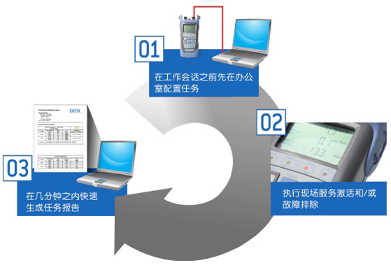 减少数据命名错误,加速测试进程 PPM-350C提供了“任务编辑器”模式,用户在此模式下可在设备的内存中预先配置即将开始的任务。到达工作位置之后,用户只需选 择任务ID、ONT编号和位置ID进行快速数据存储即可,无需将工作计划带到现场。这是将结果与客户/激活(也被称为任务)联系在一起 的最佳方法。操作易如反掌: