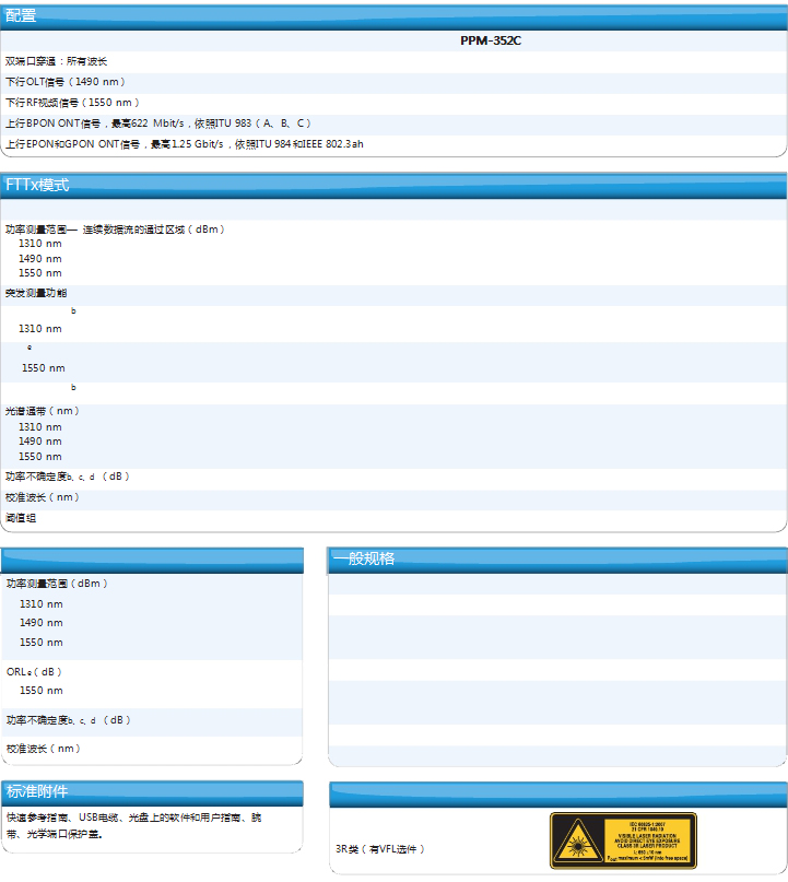 备注 a. 室温下。 b. 典型值。 c. 大约-7 dBm,CW。 d. 在校准波长下。 e. 对于APC连接器。 f. 不带电池。 g. 不包括连接器磨损。